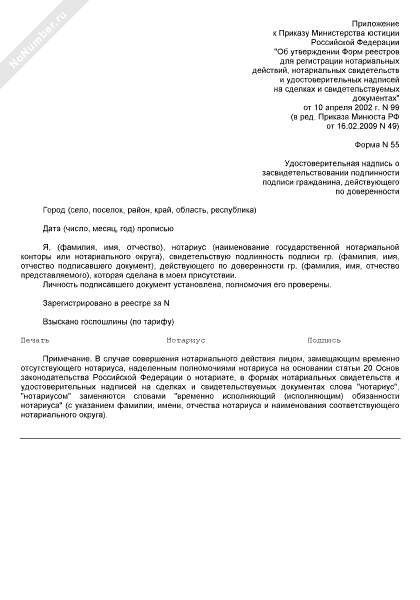 - 47Удостоверительная надпись о засвидетельствовании подлинности подписи гражданина, действующего по доверенности. Форма № 55