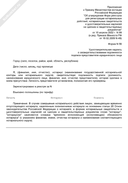 - 48Удостоверительная надпись о засвидетельствовании подлинности подписи представителя юридического лица. Форма № 56