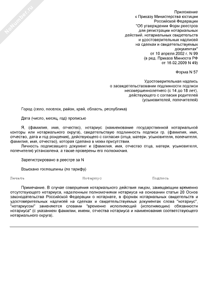 - 49Удостоверительная надпись о засвидетельствовании подлинности подписи несовершеннолетнего (с 14 до 18 лет), действующего с согласия родителей (усыновителей, попечителя). Форма № 57