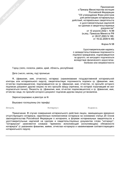 - 50Удостоверительная надпись о засвидетельствовании подлинности подписи гражданина, подписавшегося за другого, не могущего подписаться вследствие физического недостатка, болезни или неграмотности. Форма № 58