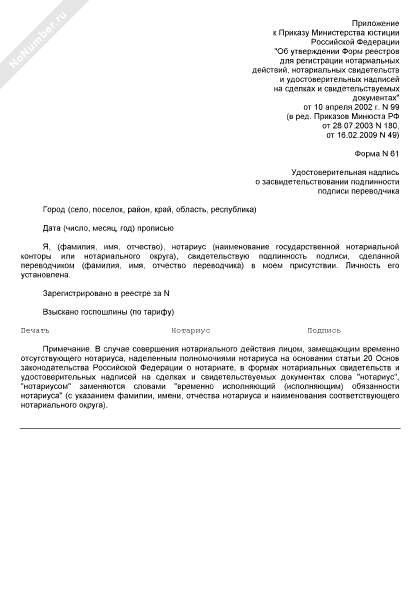 - 53Удостоверительная надпись о засвидетельствовании подлинности подписи переводчика. Форма № 61