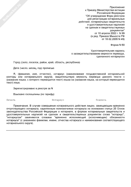 - 52Удостоверительная надпись о засвидетельствовании верности перевода, сделанного нотариусом. Форма № 60
