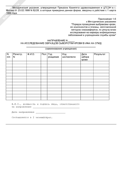 Направление на исследование образцов сыворотки крови в ИФА на СПИД в г. Москве (рекомендуемый образец заполнения)