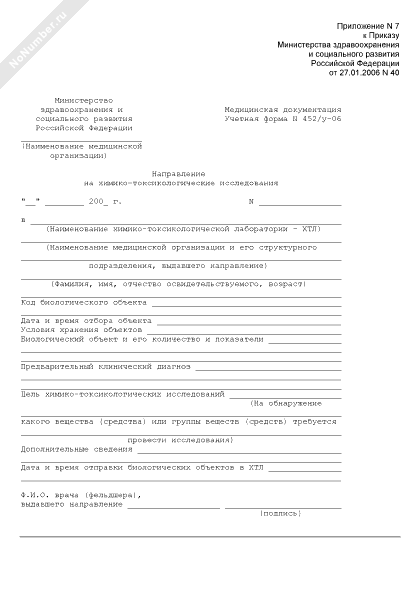 Направление на химико-токсикологические исследования. Учетная форма № 452/у-06 (рекомендуемый образец заполнения)