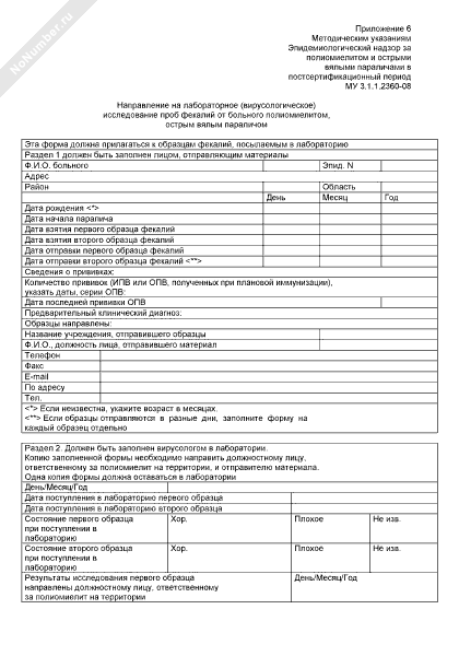 Направление на лабораторное (вирусологическое) исследование проб фекалий от больного полиомиелитом, острым вялым параличом