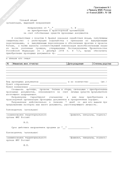 Направление на приобретение в транспортной организации за счет собственных средств проездных документов вынужденному переселенцу и членам его семьи (рекомендуемый образец заполнения)