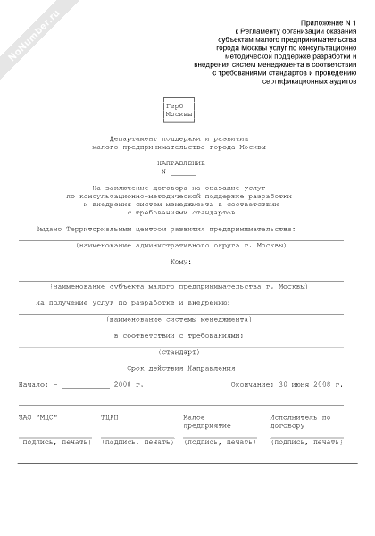 Направление на заключение договора на оказание услуг по консультационно-методической поддержке разработки и внедрения систем менеджмента в соответствии с требованиями стандартов (рекомендуемый образец заполнения)