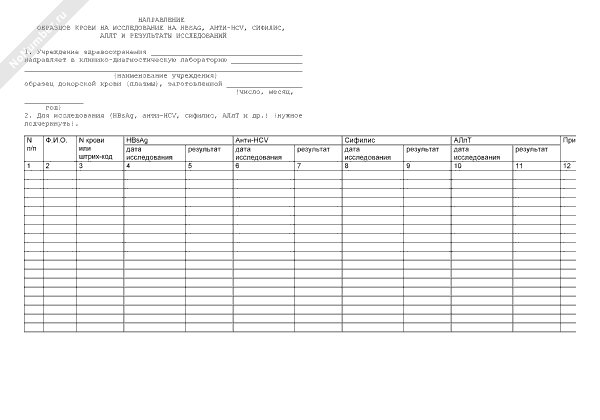 Направление образцов крови на исследование на HBsAg, анти-hcv, сифилис, АЛлТ и результаты исследований в г. Москве (рекомендуемый образец заполнения)