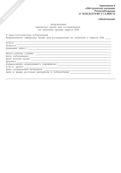 Направление сыворотки крови для исследования на антитела против вируса ЛЗН (рекомендуемый образец заполнения)