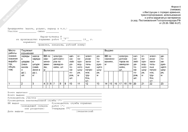 Наряд-путевка на производство взрывных работ. Форма № 4 (типовая)