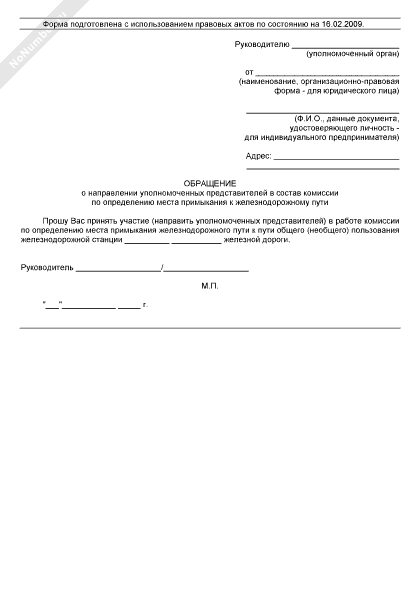 - 29Обращение о направлении уполномоченных представителей в состав комиссии по определению места примыкания к железнодорожному пути