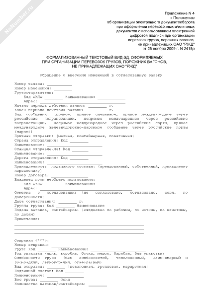 Формализованный текстовый вид электронных документов, оформляемых при организации перевозок грузов, порожних вагонов, не принадлежащих ОАО «РЖД». Обращение о внесении изменений в согласованную заявку (рекомендуемый образец заполнения)