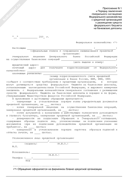 Обращение кредитной организации в Федеральное казначейство о намерении заключить с ним генеральное соглашение о размещении средств федерального бюджета на банковские депозиты (рекомендуемый образец заполнения)