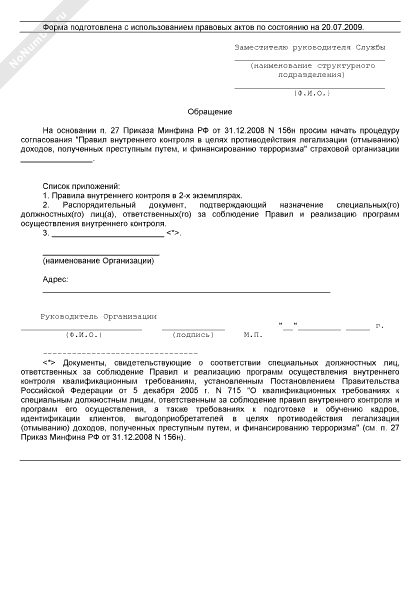 Обращение о начале процедуры согласования правил внутреннего контроля страховой организации (рекомендуемый образец заполнения)