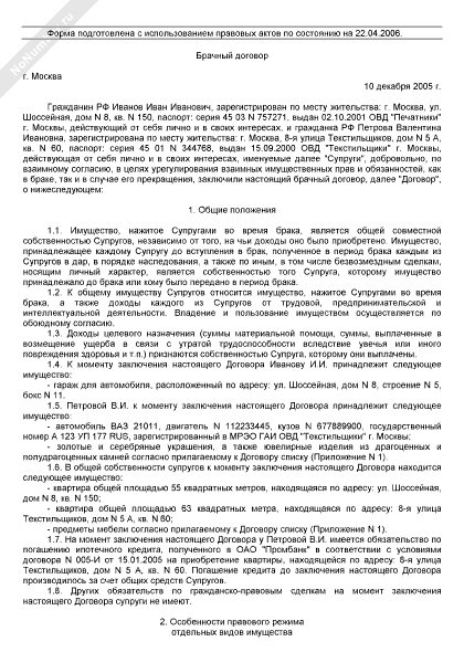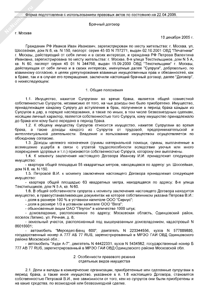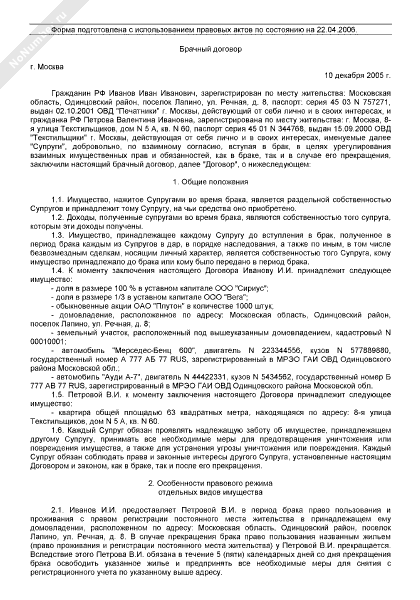 - 183Образец брачного договора для случая, когда доли и вклады в коммерческие организации оформляются только на одного из супругов