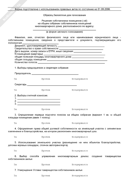 - 185Образец бюллетеня для голосования по вопросу принятия решения собственником помещения на общем собрании собственников помещений многоквартирного дома (в форме заочного голосования)