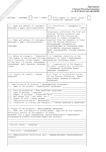 - 187Образец ветеринарного сертификата на экспортируемые из Республики Индия в Российскую Федерацию пищевую рыбу, морепродукты, готовые изделия из них (рус./англ.)