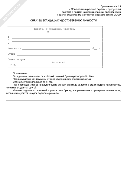 - 189Образец вкладыша к удостоверению личности на промышленных предприятиях и других объектах Министерства морского флота СССР