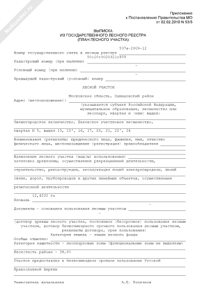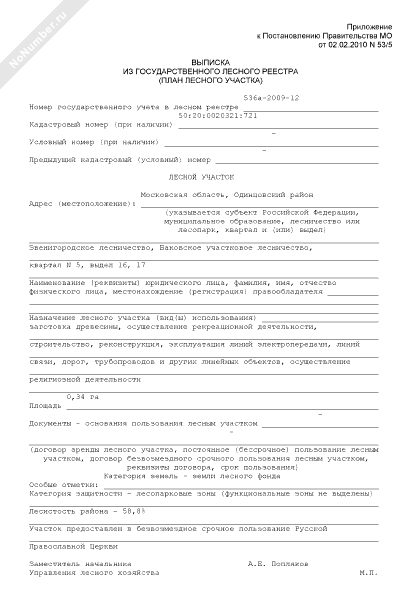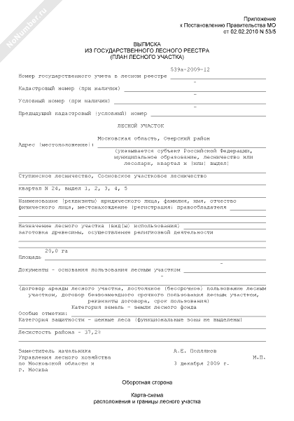 - 197Образец выписки из государственного лесного реестра (план лесного участка на территории Московской области). Номер государственного учета в лесном реестре 537а-2009-12