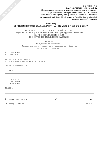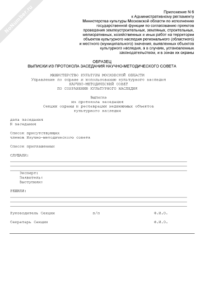 - 195Образец выписки из протокола заседания научно-методического совета Министерства культуры Московской области по исполнению государственной функции по согласованию проектов проведения землеустроительных, земляных, строительных, мелиоративных, хозяйственных и иных работ на территории объектов культурного наследия регионального (областного) и местного (муниципального) значения