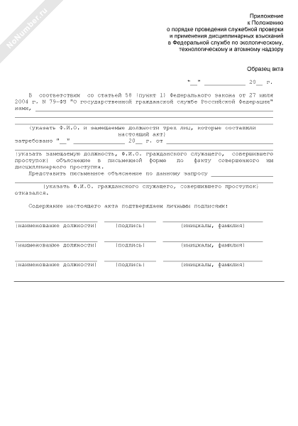 - 42Образец акта об отказе гражданского служащего Федеральной службы по экологическому, технологическому и атомному надзору дать объяснения по факту совершенного им дисциплинарного проступка