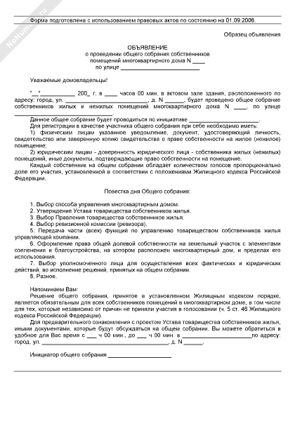 - 603Образец объявления о проведении общего собрания собственников помещений многоквартирного дома