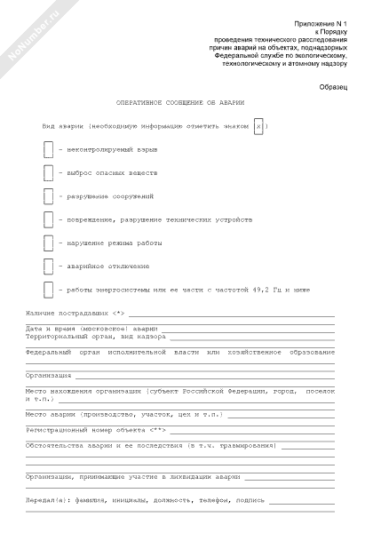 - 605Образец оперативного сообщения об аварии на объекте, поднадзорному Федеральной службе по экологическому, технологическому и атомному надзору