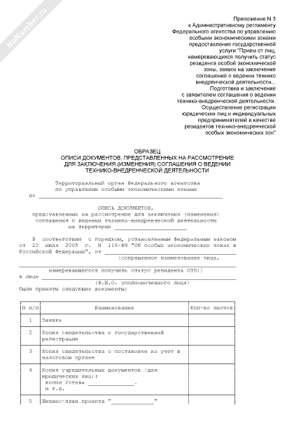 - 606Образец описи документов, представленных на рассмотрение для заключения (изменения) соглашения о ведении технико-внедренческой деятельности на территории особой экономической зоны субъекта Российской Федерации
