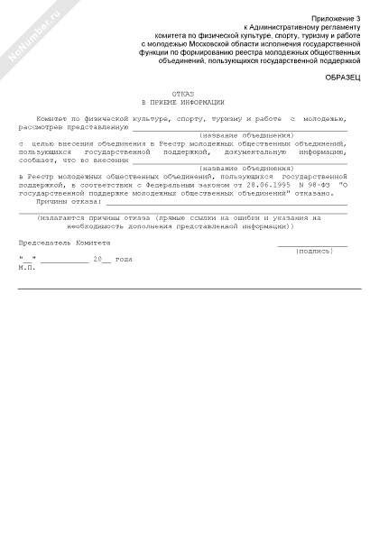 - 618Образец отказа в приеме информации для внесения в Реестр молодежных общественных объединений, пользующихся государственной поддержкой на территории Московской области
