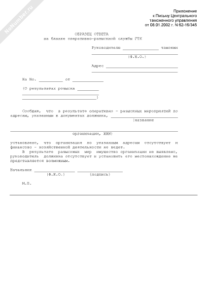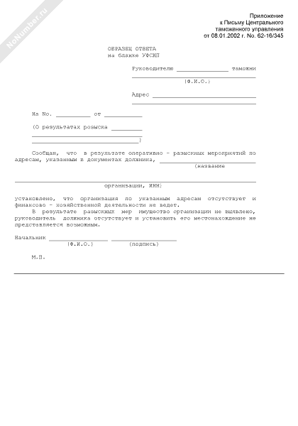 - 612Образец ответа на бланке оперативно-разыскной службы ГТК о результатах оперативно-разыскных мероприятий по адресам, указанным в документах должника