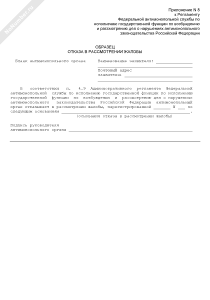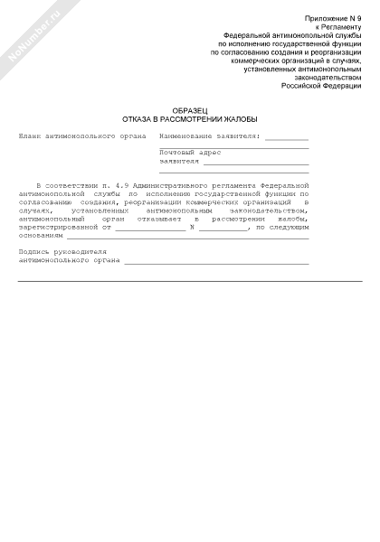 - 623Образец отказа в рассмотрении жалобы в антимонопольном органе службы по исполнению государственной функции по согласованию создания и реорганизации коммерческих организаций