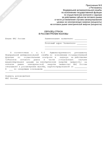 - 624Образец отказа в рассмотрении жалобы на действие (бездействие) должностного лица ФАС России по исполнению государственной функции по осуществлению контроля и надзора за действиями субъектов оптового рынка в части установления случаев манипулирования ценами на электрическую энергию (мощность) на оптовом рынке электрической энергии (мощности)