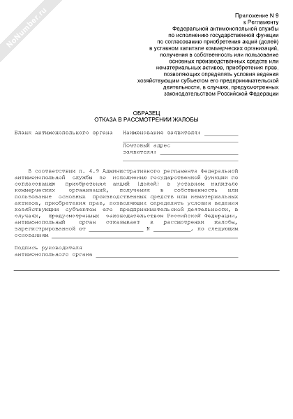 - 621Образец отказа в рассмотрении жалобы в антимонопольном органе службы по исполнению государственной функции по согласованию приобретения акций (долей) в уставном капитале коммерческих организаций