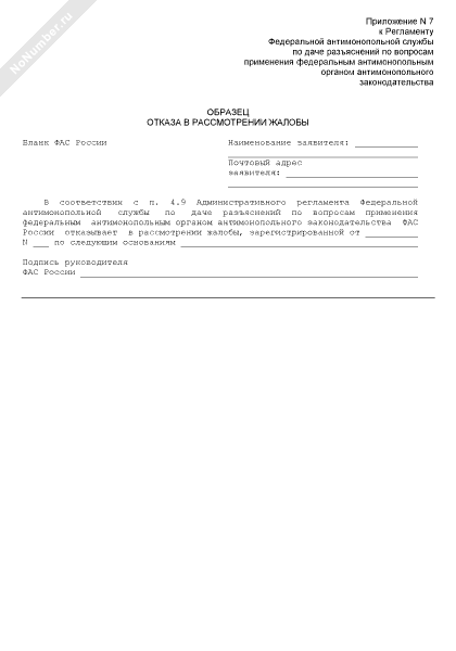 - 625Образец отказа в рассмотрении жалобы в Федеральной антимонопольной службе России по даче разъяснений по вопросам применения федеральным антимонопольным органом антимонопольного законодательства