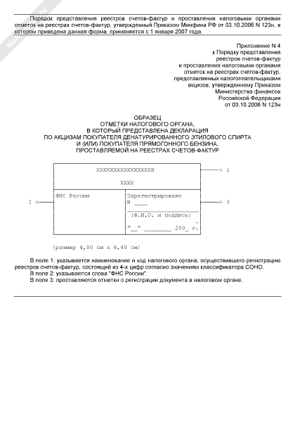 - 628Образец отметки налогового органа, в который представлена декларация по акцизам покупателя денатурированного этилового спирта и (или) покупателя прямогонного бензина, проставляемой на реестрах счетов-фактур