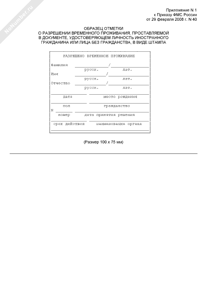 - 630Образец отметки о разрешении временного проживания, проставляемой Федеральной миграционной службой в документе, удостоверяющем личность иностранного гражданина или лица без гражданства, в виде штампа