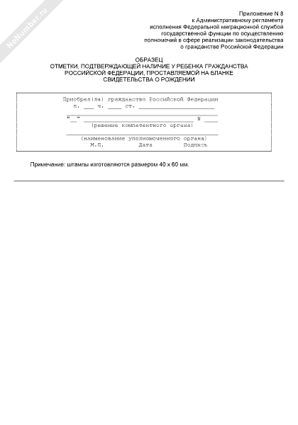- 629Образец отметки, подтверждающей наличие у ребенка гражданства Российской Федерации, проставляемой на бланке свидетельства о рождении в Федеральной миграционной службе
