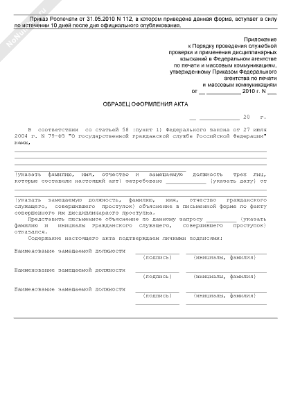 - 766Образец оформления акта в случае отказа гражданского служащего Федерального агентства по печати и массовым коммуникациям, в отношении которого проводится служебная проверка, от дачи письменного объяснения по факту совершенного им дисциплинарного проступка