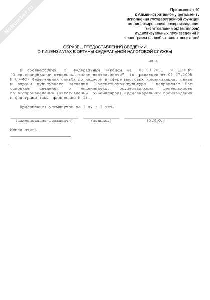 - 845Образец предоставления сведений о лицензиатах по осуществлению воспроизведения (изготовления экземпляров) аудиовизуальных произведений и фонограмм на любых видах носителей в органы Федеральной налоговой службы
