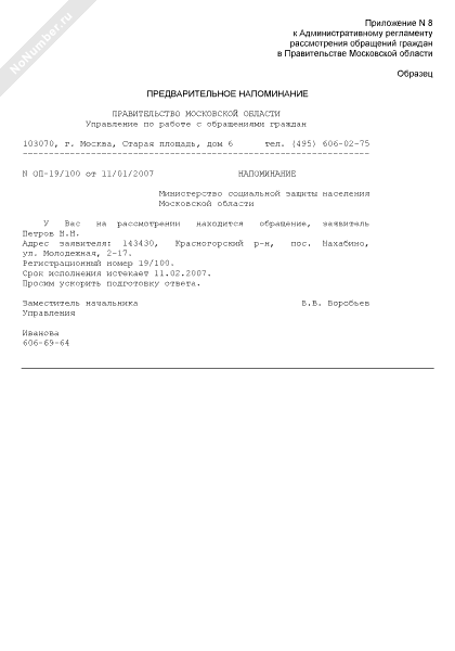 - 844Образец предварительного напоминания государственному органу о том, что обращение гражданина поставлено на дополнительный контроль с указанием контрольного срока для ответа об окончательном решении вопроса