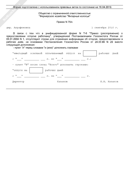 - 924Образец приказа о внесении изменений в унифицированную форму приказа о предоставлении отпуска
