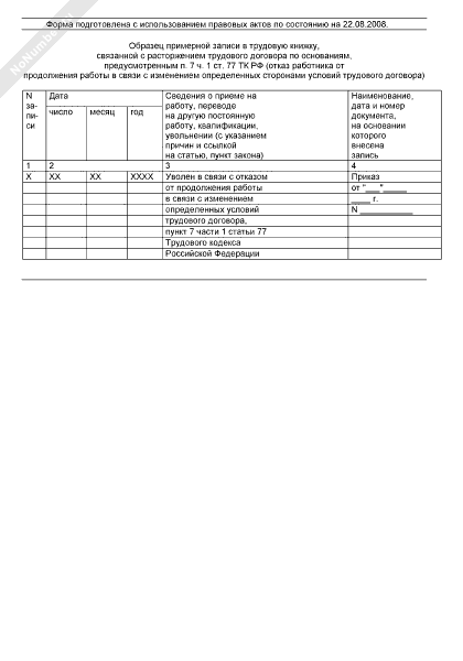 - 928Образец примерной записи в трудовую книжку, связанной с расторжением трудового договора по основаниям, предусмотренным п. 7 ч. 1 ст. 77 ТК РФ (отказ работника от продолжения работы в связи с изменением определенных сторонами условий трудового договора)