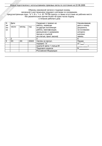 - 927Образец примерной записи в трудовую книжку, связанной с расторжением трудового договора по основаниям, предусмотренным подп. «а» п. 6 ч. 1 ст. 81 ТК РФ (прогул, а также отсутствие на рабочем месте без уважительных причин более четырех часов подряд в течение рабочего дня)