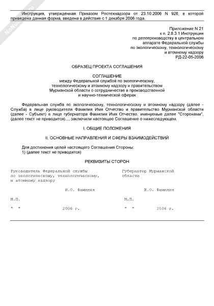 - 938Образец проекта соглашения между Федеральной службой по экологическому, технологическому и атомному надзору и Правительством Мурманской области о сотрудничестве в производственной и научно-технической сферах