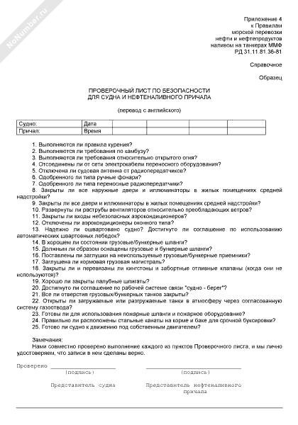 - 929Образец проверочного листа по безопасности для судна и нефтеналивного причала (вручается в иностранных портах администрацией нефтеналивного причала капитану танкера, прибывшего под грузовые операции)