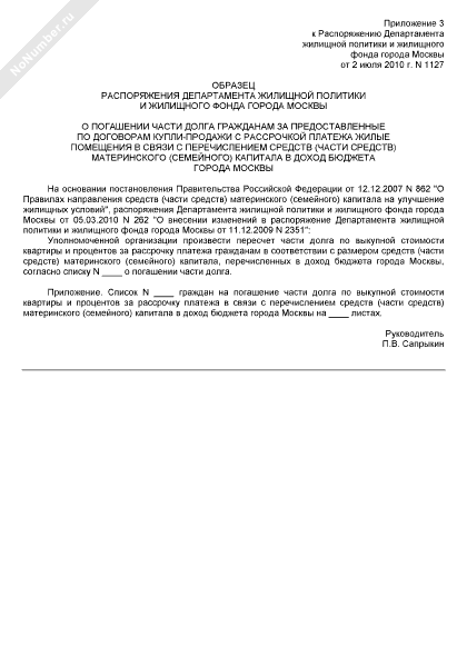 - 970Образец распоряжения Департамента жилищной политики и жилищного фонда города Москвы о погашении части долга гражданам за предоставленные по договорам купли-продажи с рассрочкой платежа жилые помещения в связи с перечислением средств (части средств) материнского (семейного) капитала в доход бюджета города Москвы