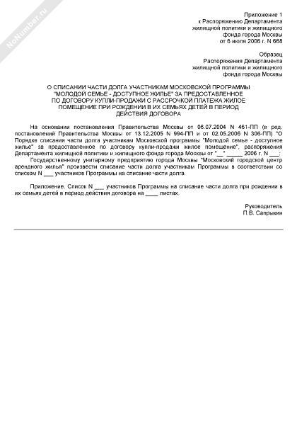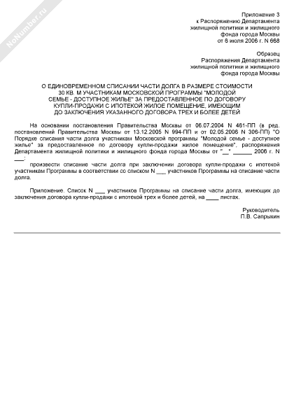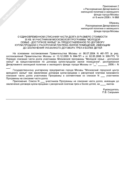 - 973Образец распоряжения Департамента жилищной политики и жилищного фонда города Москвы о единовременном списании части долга в размере стоимости 30 кв. м участникам Московской программы «Молодой семье — доступное жилье» за предоставленное по договору купли-продажи с рассрочкой платежа жилое помещение, имеющим до заключения указанного договора трех и более детей