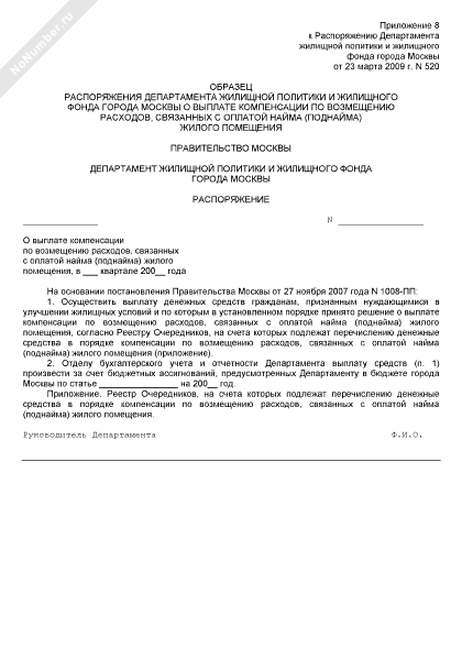 - 969Образец распоряжения Департамента жилищной политики и жилищного фонда города Москвы о выплате компенсации по возмещению расходов, связанных с оплатой найма (поднайма) жилого помещения