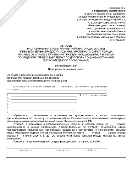 - 965Образец распоряжения главы управы района города Москвы (Префекта Зеленоградского административного округа города Москвы) об отказе в признании граждан нуждающимися в жилых помещениях, предоставляемых по договору социального найма (безвозмездного пользования)
