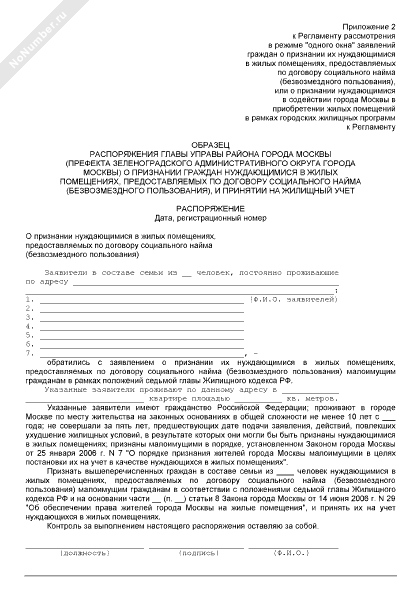 - 964Образец распоряжения главы управы района города Москвы (Префекта Зеленоградского административного округа города Москвы) о признании граждан нуждающимися в жилых помещениях, предоставляемых по договору социального найма (безвозмездного пользования), и принятии на жилищный учет